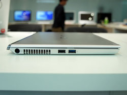 また、液晶オープン時には本体奥側が持ち上がる構造を採用。これによりVGA端子が挿しやすいよう配慮した。端子類はフルサイズのHDMI出力、VGA、LAN、ステレオミニ出力などを各1系統装備。USB端子は前述のスマホ等への給電に対応したUSB 3.0端子を1系統と、USB 2.0端子を1系統の計2系統を備えている。また、メモリーカードスロットはSDXCにも対応している。