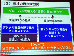 そして「一方で我々は単独で勝負する垂直統合モデルで展開してきた。これはグローバルで競争するのは難しい状況になっている」とコメント。「そこで今回、当社の技術力とブランド力を活かし、生産力と調達力に優れたホンハイと新たな垂直統合モデルを作る」とした。さらに「マーケティング力を強化し、コモディティ化したデジタル商品分野でも逃げるのではなく積極果敢に攻める事業拡大を図る」とし、「同時に、独自技術を確保したオンリーワンデバイスや商品開発に特化し、新オンリーワン商品を創造するビジネスモデルを構築していく」と述べた。