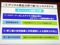 そしてもう一点が前述のように「堺工場の安定創業と共同運営による競争力の向上」だ。ホンハイが持つ大口ユーザーからの受注で堺工場の安定操業を図り、ホンハイと共同運営することでコスト競争力ある工場へと変えることがもうひとつの目的だとした。