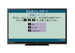 さらにテレビの電源を入れると、自治会の掲示板へ自動アクセスし、、地域情報を表示する機能も搭載。またテレビに「体調アンケート」を表示し、「よい」「ふつう」「いまひとつ」から選択して連絡することもできる。