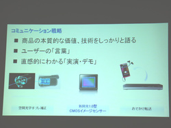 具体的には、社員の専門性を高めていくこと。「ソニーでは、カメラはコンパクトデジカメ、一眼と展開、ビデオカメラを合わせると、日本で一番の会社になっています。しかしそれをお客様に提案していくにはまだまだ足りない。社内的には『プロのユーザーになる』といっておりますが、店頭を啓発して、お客様へ提案していくか。いろいろなお客様へ提案するには翻訳が必要です。