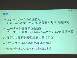 故障や保守、サービスの受付や、使い勝手の提案をさせていただくこと、お客様の目線からエレキとゲームを融合させていきたい。それこそが平井社長の言う“OneSony"ではないかと思います」。