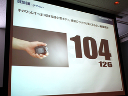 本体サイズ74W×53H×35Dmm、質量104g(バッテリー装着時は126g)と、手のひらに収まるサイズの小型軽量モデル。504万画素の1/2.5型CMOSセンサーを備えており、5倍デジタルズームに対応する。対応記録メディアはSD/SDHC/SDXCカード。