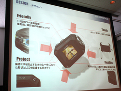 本体はポリゴン形状のデザインを採用することで強度も高めた。また、誤ってボタンを押してしまうなどの操作ミスが起きにくいよう、本体と一体型となったデザインの操作ボタンを配置している。さらに、三脚穴を本体の側面と底面に備えることで、様々な撮影シーンに対応する。