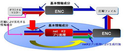 「net K2」の技術は、ビクタースタジオで採用されている独自の高音質化技術「K2テクノロジー」をベースにした、同社グループのソフトエンタテインメント事業会社であるビクターエンタテインメント(株)との共同開発による圧縮音声向けの音質向上技術である。