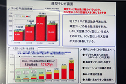 居石氏は「2003年〜2006年にテレビを購入したユーザーの買い替え需要がそろそろ到来すると見ている。この層に大型テレビを提案していきたい。また、昨年一昨年にテレビを買ったけれど、もっと大きなサイズにしておけば良かった!というユーザーさんにもアピールしたい。デジタル放送に移行したこと、高画質ソフトが増加したこともあり、60V型以上のテレビの時代が来ていると思う。大画面の良さ、楽しみをあらゆる角度から提案し、お客様の満足度を上げていきたい」と語った。
