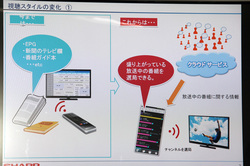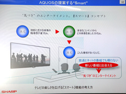 シャープの考える「スマート」のコンセプトは、「“気付き”のエンターテイメント」なのだという。山本氏は「放送番組の数は増えているし、インターネットコンテンツもテレビのなかで楽しめるようになった。このような状況の中、テレビを見ながら“こんなコンテンツがあったんだ”と気付いて貰えるような機能が必要だと考えている」と語り、「ビジュアルモーションガイド」「おしえてリモコン」「AQUOS City」の3つを紹介した。