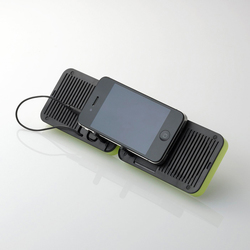 本体を開いた状態で背面のスタンドを起こしてスピーカーを設置、スマートフォンを本体においてリスニングが楽しめる。実用最大出力は2W。
