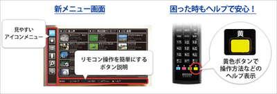 今回のアップデートにより、さらに簡単で手軽なLinkTVの操作が行えるよう、メニュー画面を全面的にリニューアル。画面にわかりやすいアイコンメニューとリモコンボタン説明を表示する。操作に迷ったときでも、リモコンの黄色ボタンを押せばヘルプ画面を表示させることができる。