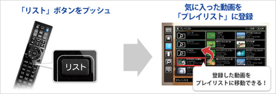 気に入った動画を整理して登録できる「プレイリスト」機能も追加された。リモコンの「リスト」ボタンを押すだけでプレイリストへの登録が行え、複数のプレイリストを自由に作成できる。プレイリストに整理した動画も通常の動画同様に連続再生して楽しむことができる。なお、同機能を利用するにはUSBストレージが必要となる。