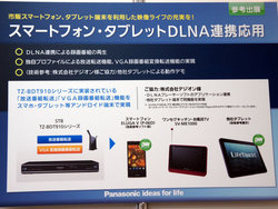 加えて、独自に拡張したプロファイルを使用しているため、現在はワンセグTV「SV-ME1000」としか接続できないSTB「TZ-BDT910シリーズ」のDLNA機能について、一般のスマートフォン/タブレットと連携させる参考デモも実施。デモではDiXiMアプリをインストールした「ELUGA V P-06D」やNEC製タブレットとネットワークで接続し、DLNA経由でコンテンツを再生していた。