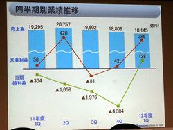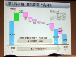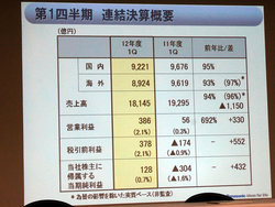 1Qは、国内市場は東日本大震災からの復興需要等ゆるやかに景気の回復が見られたものの、薄型テレビを中心に家電市況は厳しい状況が続いたとのこと。またグローバルでは、欧州の政府債務危機再燃などで景気は減速傾向となった。売上高は1兆8,145億円で、国内AV市場の需要低迷の影響で前年同期比94%にとどまった。売上高の内訳は、国内が9,221億円、海外が8,924億円。なお、ユーロ安をはじめとした為替の影響は427億円だっという。