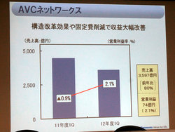セグメント別の売上高は、AVCネットワークスが売上高3,597億円(前年同期比80%)、営業利益74億円。ビジネス向けノートパソコンなどBtoB事業の売り上げは前年を上回ったが、薄型テレビやBDレコーダーなどBtoC事業の売り上げが大幅に減収となったとのこと。