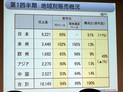 地域別で見ると、日本が全体の51%となる9,221億円(前年比95%)で、アメリカが2,440億円(前年比102%)、欧州が1.682億円(前年比85%)、アジアが2.275億円(前年比90%)、中国が2,527億円(前年比93%)。