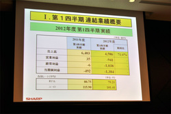 本日シャープは都内にて12年度第1四半期の決算発表会を開催し、代表取締役社長の奥田隆司氏が出席。決算内容の説明と、今後の取り組みに関する詳細を語った。