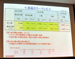 液晶テレビはASEANなど新興国での販売は好調に推移したものの、中国市場での販売低迷、国内市場の大幅な需要減少により伸び悩んだ。当期売上高の実績は777億円、販売台数は166万台。年間の売上高予想は5,000億円から3,500億円に、販売台数予測は1,000万台から800万台へ下方修正された。第2四半期以降は、いっそうの市場拡大が期待される新興国地域への取り組みを強化する。