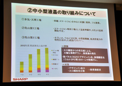 中小型液晶については、多気・天理工場は車載/スマートフォンを中心に好調に推移していることから、現在フル操業の状態にある。亀山第1工場は8月からスマートフォン専用工場として量産開始が予定されている。亀山第2工場についても、タブレットやウルトラPCなどの成長による安定稼働に期待を寄せる。奥田氏が課題として挙げるのは、大口顧客からの受注減による大幅な操業ダウンと、操業損の発生だ。また「IGZO」新パネルのデザインイン先や、ウルトラPCなどの新規顧客先へのローンチ時期がずれたことも指摘をしながら、これらの対策としてデザインインの拡大や大口顧客の受注を増やすことで、操業損を解消していく考えを示した。