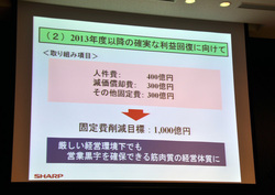 今期末までには「大型液晶事業のオフバランス化」「第三者割当増資」「在庫の適正化と固定資産の圧縮」「設備投資の圧縮」などのメニューを含んだ、合計4,000億円規模の財務体質改善対策に取り組む。これらの取り組みにより、2012年度末に棚卸資産、ならびに有利子負債を削減するための目標値も示された。奥田氏は「2013年度の転換社債2,000億円の償還を見据えた資金の安定調達を図るため、主要金融機関によるバックアップ体制も検討していると」と説明を付け加えた。