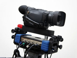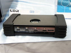 デモでは、JVCの4K対応カムコーダー「GY-HMQ10」からの映像をHDMI 4系統で本機に出力、SDIに変換して同社の非圧縮SDIレコーダー「UDR-N50」に送ってそこからモニターに映像を映し出すというシステムを構築。「GY-HMQ10」の4K映像を非圧縮で記録してから出力できるソリューション提案を行っていた。