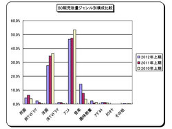 また、ジャンル別を年度別で比較してみるとDVD、BD両メディアとも年毎に洋画離れの傾向が見られるという。BDのジャンル別構成比に占める洋画の割合は2010年上期が36.3%、2011年上期が34.6%、2012年上期が27.6%だった。