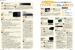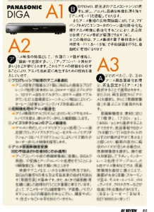 そして今回のアニメ特集で、アニメファンの皆さまに激推ししたいのが、AVメーカー7社にアンケートを行った「技術・開発者さん アニメモードをもっと教えて!」(86-87p)です。アニメモードはあるか、アニメモードで何をしているか、アニメに効くオススメの使い方は何か、という3つの質問をメーカーに投げ、頂戴した回答をそのまま掲載させて頂きました。特に「アニメに効くオススメの使い方は何か」に対する答えは、本誌だけにしか書かれていない貴重な情報!!これを読んで、お手持ちの機器で試して頂ければと思います。