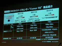 型番に“IMX”が付く「IMX135」と「IMX134」は、従来のRGB(赤/緑/青)画素にW(白)画素を加えることで3dBほど感度を向上させた「RGBWコーディング」機能と、撮影時に同一画面内で2種類の露出条件を設定、そこで得た画像に信号処理をすることで、ダイナミックレンジの広い画像を生成する「HDR(ハイダイナミックレンジ)ムービー」機能を搭載している。