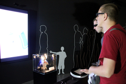 こちらは、あらかじめ撮影しておいた3D映像を、タブレットを使って上下左右など視点を変えて楽しむことができるというもの。3D映像の拡大/縮小も勿論行える。オークションでの商品プレビューや、美術館での注目製品展示や、医学生の解剖擬似体験などでの使用が想定されている。来場者は、3D映像を手元のタブレットで上下左右に動かして楽しんでいた。