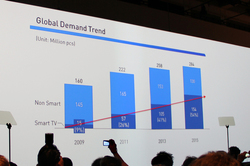 家のなかの様々な機器をつなげる機能として、「ビエラ・コネクト」や「ビエラキャスト」などを進化させてきた同社。全世界的に見てもスマートテレビの需要は着実に拡大してきており、2009年には市場の9%(1,500万台)にしかすぎなかったものが、2011年には26%(5,700万台)に急上昇。2015年にはテレビ市場の54%(1億5,400万台)がスマートテレビになると見ているという。