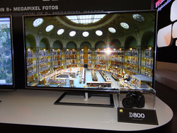 ほかにも55型の「55XS5」をベースに、ニコンのデジタル一眼カメラ「D800」で撮影した静止画表示のデモンストレーションや、「CEVO ENGINE 4K」を組み込んだ55型の試作機と同社製VAパネルを搭載したフルHDのREGZAを用意し、同じブルーレイのソースを表示しながら、新エンジンの高精細な4K超解像処理の実力を紹介するコーナーも設けている。