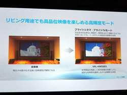 画質モードには、「VPL-VW1000ES」にも搭載されている「ブライトシネマ」「ブライトTV」モードも装備。グリーンの成分を強める事で明るさを確保する一般の手法と異なり、光学部品・信号処理の最適化により、バランスのとれた色彩豊かな高品位映像と明るさを両立するという。これにより白壁による投写光の照り返しや完全遮光の難しい環境下においても、クッキリした高品位映像が楽しめるとしている。