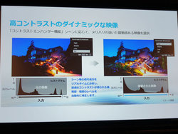 また、「コントラストエンハンサー」も搭載。シーンごとの信号成分をリアルタイムに分析し、シーンに応じた最適なコントラストが得られるよう、明部・暗部のレベルを自動的に補正する。
