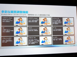 そのほか画質モードには、フィルムガンマと色域を導入することで、フィルム画質を再現する「シネマフィルム1」、それよりもやや輝度を上げたリビングシアター向けの「シネマフィルム2」、コンテンツの持つ画質そのものを忠実に再現したい場合や、調整のない素直な画質を楽しむのに適した「リファレンス」、そして「TV」「Game」「Photo」「User」モードを搭載。ブライトシネマとブライトTVを合わせ計9種類を、2Dと3Dでそれぞれ選択できる。