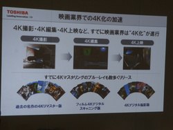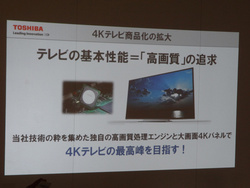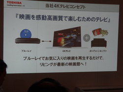 東芝では4Kテレビのコンセプトを発表。ブルーレイなどお気に入りのフルHDコンテンツを高精細に4K復元を行い、「映画を感動高画質で楽しむためのテレビ」を追求する。