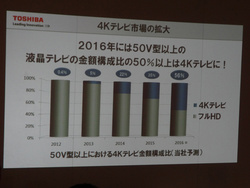 今後の4Kテレビ市場の予測については、「2016年には50V型以上の液晶テレビの金額構成比について、およそ50%以上が4Kテレビになるはず」とコメント。徳光氏は「2013年が4Kテレビの元年とみている」と述べた。