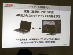 またPCでも4K出力対応のdynabookを2013年度に商品化していく。徳光氏は「4K出力に対応したノートPCにより、新しい発見と感動をお客様に伝えられるだろう」と意気込みを語った。