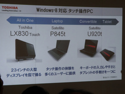 また10月の「Windows 8」リリースに合わせて、タッチ操作に対応するPCも拡充する。「LX830 Touch」は23インチの大型タッチディスプレイを搭載したオールインワンタイプのモデル。国内モデルは21インチになる見込みだ。「Satellite P845tはタッチパネル搭載のクラムシェルタイプのノートPCだ。