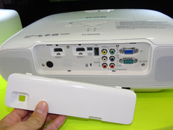 型番に「W」の付くモデルがワイヤレス対応機。60GHz帯のワイヤレスAV伝送技術「WirelessHD」規格を採用する。本体のほかに専用のWirelessHDトランスミッターが同梱されており、HDMI信号をワイヤレスで送受信することができる。WirelessHD信号の最長伝送距離は直線約10m。もちろんプロジェクター本体にHDMI端子も搭載されており、HDMIケーブルで接続して使うことも可能だ。
