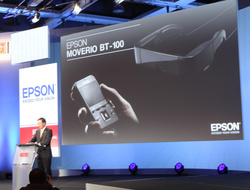 エプソンの強みはさらに「デジタルとアナログの世界を結びつける力」であると碓井氏は語る。その近年の成果の一つは、国内でも展開する“シースルーモバイルビューアー“Moverio”「BT-100」であるとした。本機が小型化・軽量化を極めたウェアラブル機器でありながら、シースルーレンズを採用して、映像を見ながら周囲の風景を確認できるというメリットを備えていることを碓井氏は強調しながら、「プロジェクターが大画面ホームシアターを変えてきたように、今後はBT-100のような価値を持った機器がユーザーのパーソナルエンターテインメントを変えていくだろう」と意気込む。