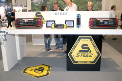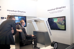 日本で大注目のヘッドアップディスプレイ(HUD)も登場。こちらは欧州向けにはまだ参考展示段階だという。しかし多くのユーザーがひっきりなしにHUDブースに訪れており、関心の高さがうかがわれた。