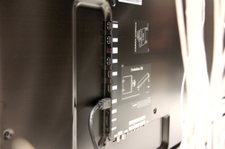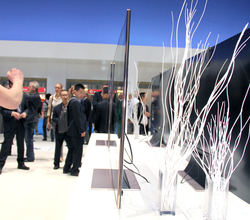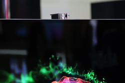 55V型有機ELテレビは薄さを全方位から体感できるよう、スタンド設置に加え天吊りも行っている。金属製のボディは非常に薄く、裏側までスッキリとしたデザイン。しかし本機は発売はしばらく先となる見込みとのことだ。
