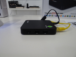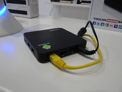 香港に拠点を置くicon BITはテレビ用のAndroidアダプター「TOUCAN」シリーズを展示。Android OS 4.0を搭載したネットワークメディアプレーヤー。CPUは1.2GHzのCortex A8。本体にLAN端子とHDMI端子を備え、ネットワーク機能を持たないテレビでAndoridプラットフォームのマルチアプリが楽しめるようになる。またUSB端子2系統、SDカードスロットも備えており、外部ストレージをつなぐことも可能だ。
