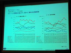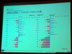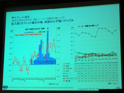また、タブレット製品については右肩上がりで拡大が続いており、「新製品が出れば動きがある」と今後の伸長が期待される市場であると発表。メーカー別の販売台数シェアではアップルが6割を占め独走状態で、残りの4割を29社ものメーカーが争っている。この状態について森氏は「今後Windows 8が登場すると、急激ではないだろうが徐々にアップルの独走状態が変わってくるのではないか」と分析。また「amazonのKindleが国内展開された場合、さらに動きが出てくるだろう」とした。