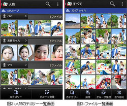 また、クラウド上で顔やシーンを識別して「年月」「人物」「イベント」「場所」「機種・サービス」ごとに自動でグループ分けするといった整理機能や、スライドショーの自動作成、ベストショット写真の自動抽出、外部サービス「Evernote」「Eye-Fi」「ハイカム」と連携し、写真・動画も一括で保存、閲覧、整理することができる。
