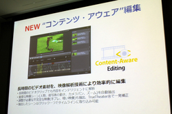 コンテンツアウェア編集は、パンやズーム、人物の顔、動きなど見どころのある場面を抽出して表示することで、大量の映像データの内容を短時間で把握できる機能。TrueTheater機能により、映像の明るさや手ブレのあるシーンをまとめて簡単に補正することも可能だ。