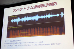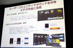「AudioDirector」は音響編集ソフト。スペクトラム波形表示に対応し、ウェーブフォームでは見つけることのできないノイズなどの成分を視覚的に確認できる。また、それを簡単に補正することが可能となっている。またミキシングや効果音の挿入なども行える。効果音ライブラリはオンラインコミュニティで共有できる。