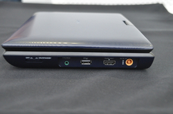 本体側面にはHDMI出力端子を1系統搭載。ハイビジョンテレビなどに接続して据え置き型のBDプレーヤーとしても活用できる。他にもヘッドホン端子を搭載。LAN端子とネットワーク機能は非搭載。