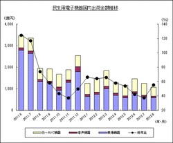 分野別に見ると、映像機器は587億円(前年比43.9%)と13ヶ月連続でマイナス、音声機器は70億円(前年比74.0%)と20ヶ月連続でマイナス、カーAVC機器は416億円(前年比81.5%)と2ヶ月連続でマイナスとなった。