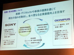 デジタルイメージング、ゲーム、モバイルをコア事業として強化を図る同社では、同時に、次の成長分野と位置付ける「メディカル事業」に注力する。カメラ、レコーダー、モニター、プリンターといった従来からの医療用周辺機器事業に加え、2010年に細胞分析機器メーカー「iCyt社」、2011年に医療検査・診断機器開発メーカー「Micronics社」を相次ぎ買収してライフサイエンス事業に参入。さらに「事業を飛躍させるためには医療機器本体への参入が不可欠」との見解の中で、同社独自での展開ではなく、医療分野の技術やノウハウ、顧客インフラを持つ「オリンパスとの提携が最も効果的」と判断した。「医療用周辺機器事業とは異なり、大きく踏み込んだ新しい挑戦」(平井社長)だ。