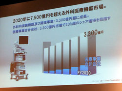 医療事業に関する合弁会社が本年12月中に設立される。新会社の利益計画の見通しとして平井社長は「参入する外科内視鏡機器及び関連事業の市場は、2020年に3300億円超の規模が予想される。そこで20%のシェアを獲得したい」と意欲を示すと共に、新会社は、2020年に売上高2000億円以上を掲げ、中核事業として強化を図る、ソニー医療事業のロードマップの一部として位置付けられる。2020年に2000億円以上という売上高の3分の1をこの新会社が担い、残りを、ライフサイエンス事業で3分の1、既存の医療周辺機器事業で3分の1を見込む。