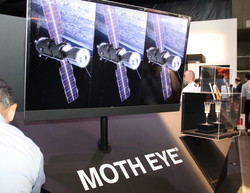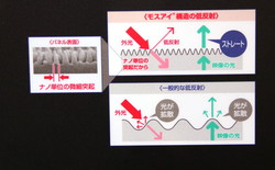 モスアイについて同社説明員は「シャープとしては、低反射性はテレビに必要と考え、これまでグレアパネルは採用してこなかった。だが、一方でノングレアのコントラスト感も魅力に感じていた。今回のモスアイによって、クアトロンの4原色の色再現能力を邪魔せず出すことが可能になる。いわば、パネルのスペックそのものが見えるようになる」と語る。